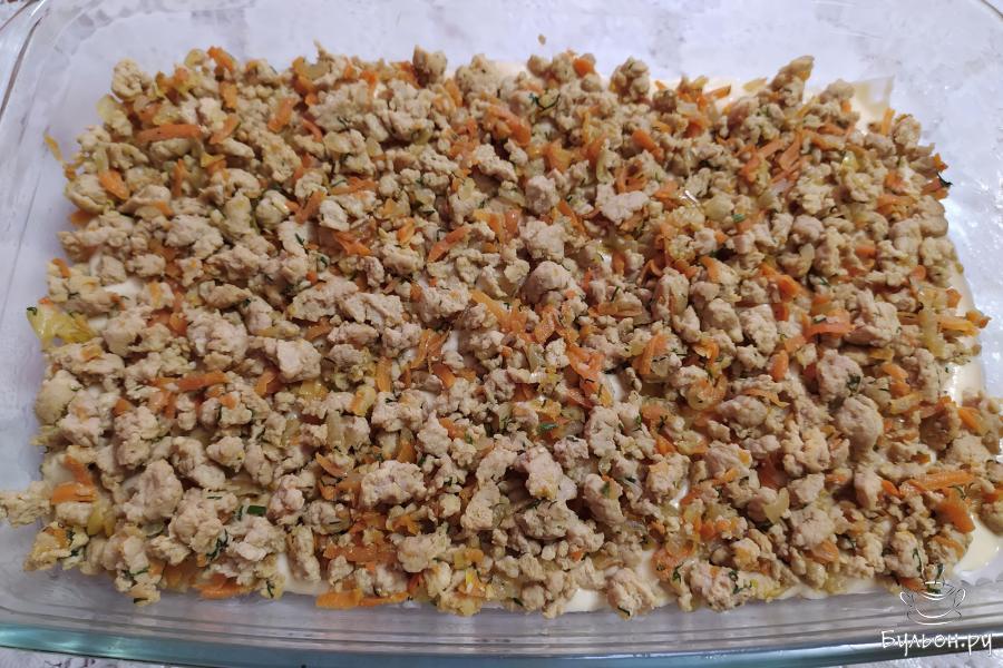 3. Далее добавить к овощам фарш, обжаривать 5 минут, помешивая и разбивая крупные комочки фарша лопаточкой.