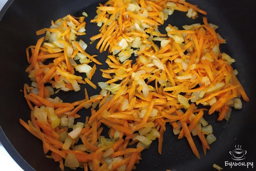 2. Морковь натереть на крупной терке, отправить в сковороду к луку. Жарить пару минут до мягкости моркови.