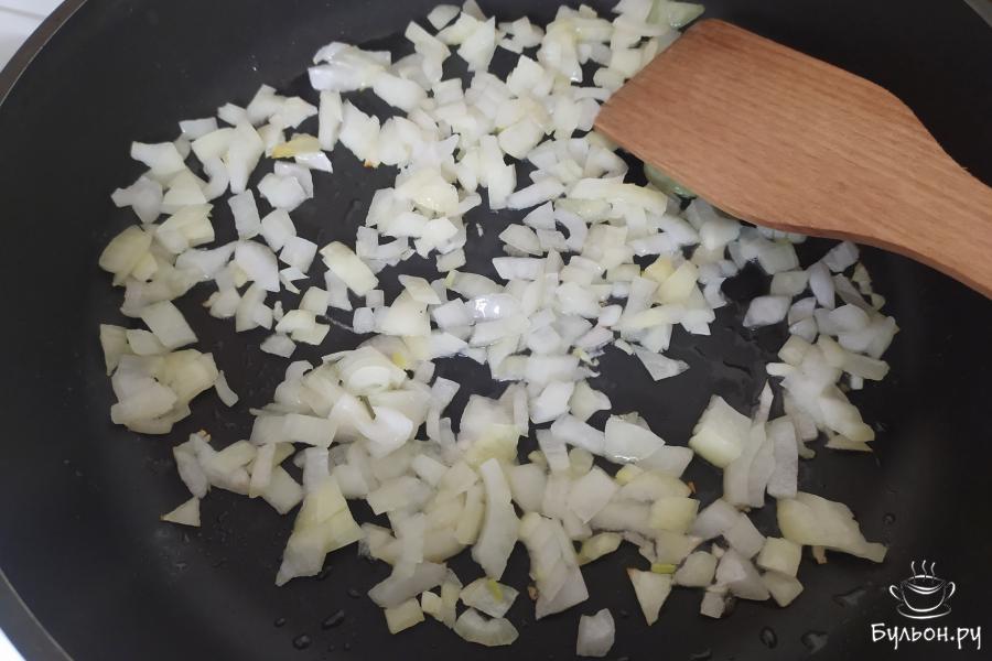 1. Лук нарезать средним кубиком. Обжарить до прозрачности на растительном масле (2 ст л) несколько минут.