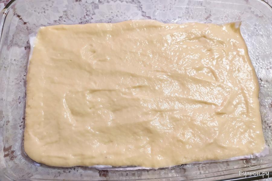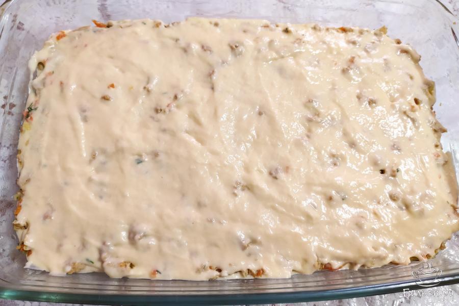 12. Поставить пирог в разогретую духовку выпекаться при температуре 180 градусов. Готовить 35-40 минут. Пирог из жидкого теста с фаршем готов.