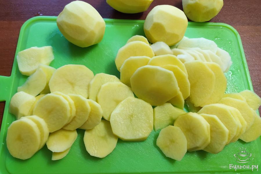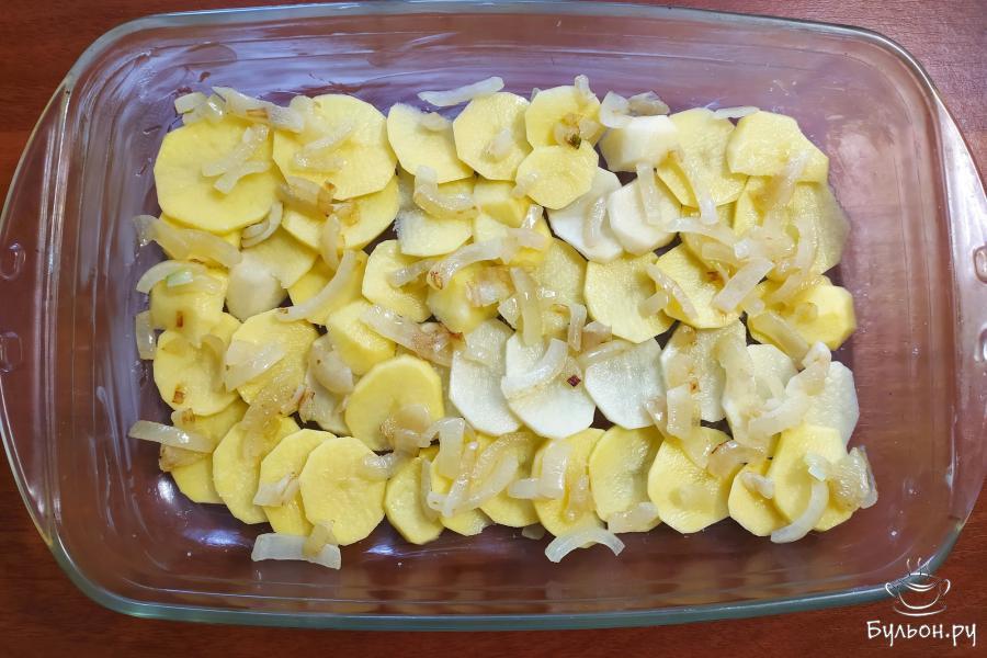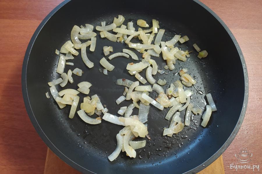 2. Очищенный лук нарезать четверть кольцами. Обжарить его на подсолнечном масле до прозрачности пару минут.