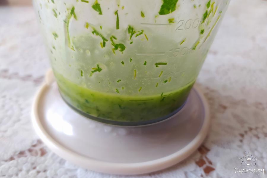2. В глубокий стакан поместить петрушку, укроп, очищенные зубчики чеснока, щепотку соли, налить масло.