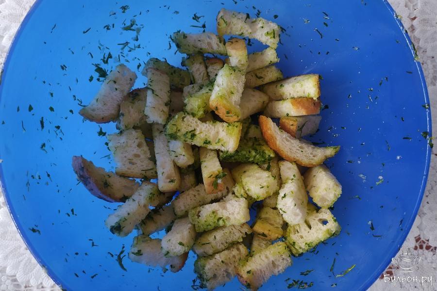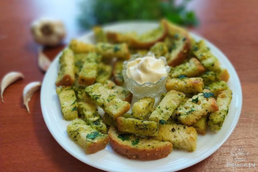 Сухарики с зеленью и чесноком в духовке - эта вкусная закуска из хлеба. Похрустеть сухарики любят многие, причем как взрослые, так и дети. Магазинные сухари кушать вредно и не полезно, так как в них много химии. Поэтому предлагаю сделать эти вкусные сухарики дома, они получаются ароматные и хрустящие. Отлично подойдут к первым блюдам и будет замечательная закуска к пенному напитку. Рекомендую приготовить и попробовать.