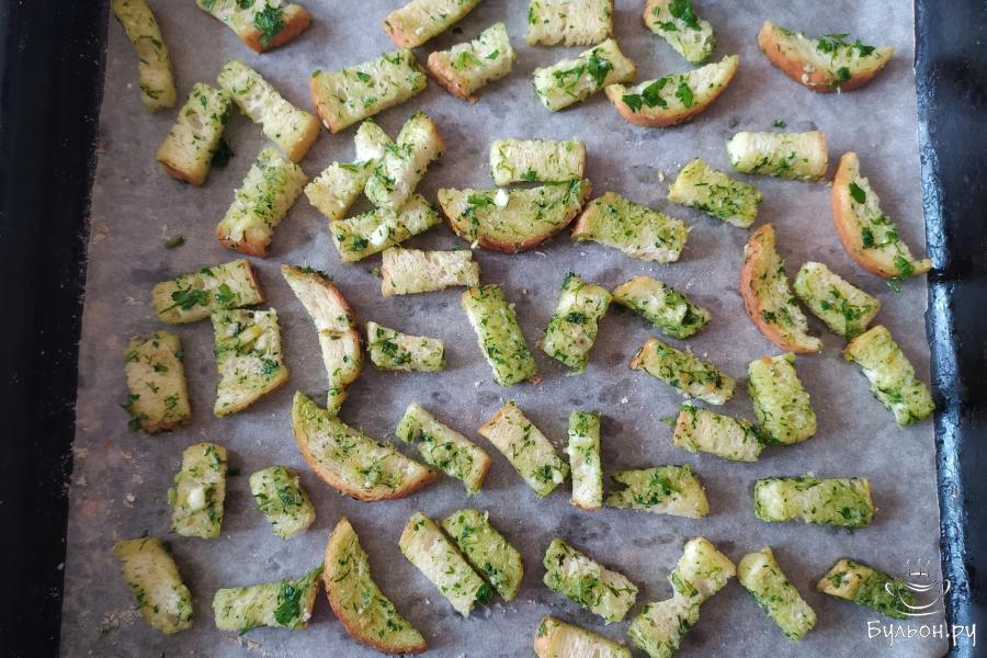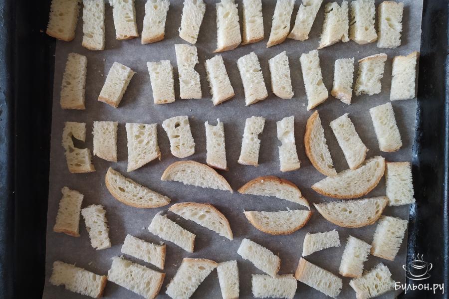 1. Ломтики хлеба нарезать небольшими брусочками. Выложить нарезанный хлеб на противень. Духовку прогреть до 200 градусов. Подсушить сухарики в духовке до твердости. В зависимости от духовки на это потребуется от 5 до 10 минут.