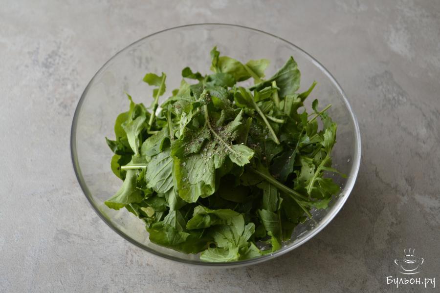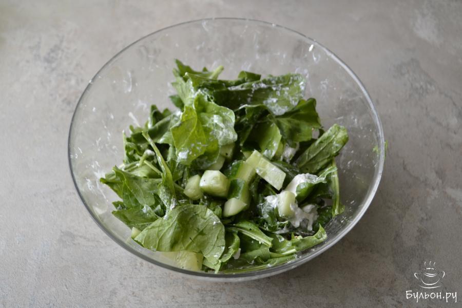 Салат руккола замечательно сочетается по вкусу со свежими огурцами и рассольным сыром сиртаки. В салате есть все: и легкая горчинка рукколы, и сливочный вкус сыра, и свежесть огурца. Салат получается очень легкий, ароматный, вкусный. Дополнительную заправку к такому салату можно не делать, будет достаточно ложечки оливкового или другого растительного масла. Готовить салаты из свежей зелени лучше перед самой подачей, чтобы они не потеряли внешний вид и вкус. Рецепт не сложный - справится даже подросток.