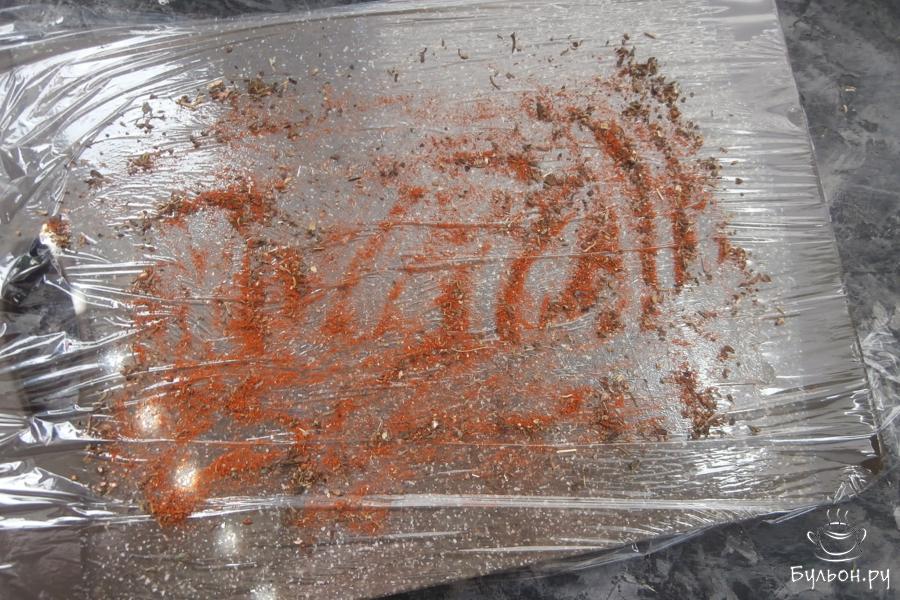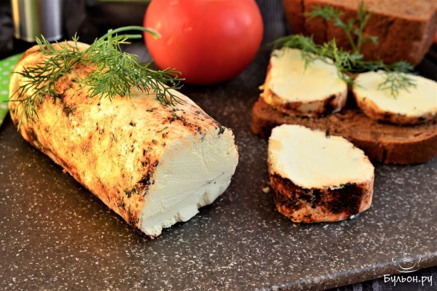 10. Аккуратно сыр завернуть в пленку, чтобы специи распределились по краям сыра. Концы пленки перевязать. Дать сыру полностью остыть и поместить его на 1-1,5 часа в морозильник.