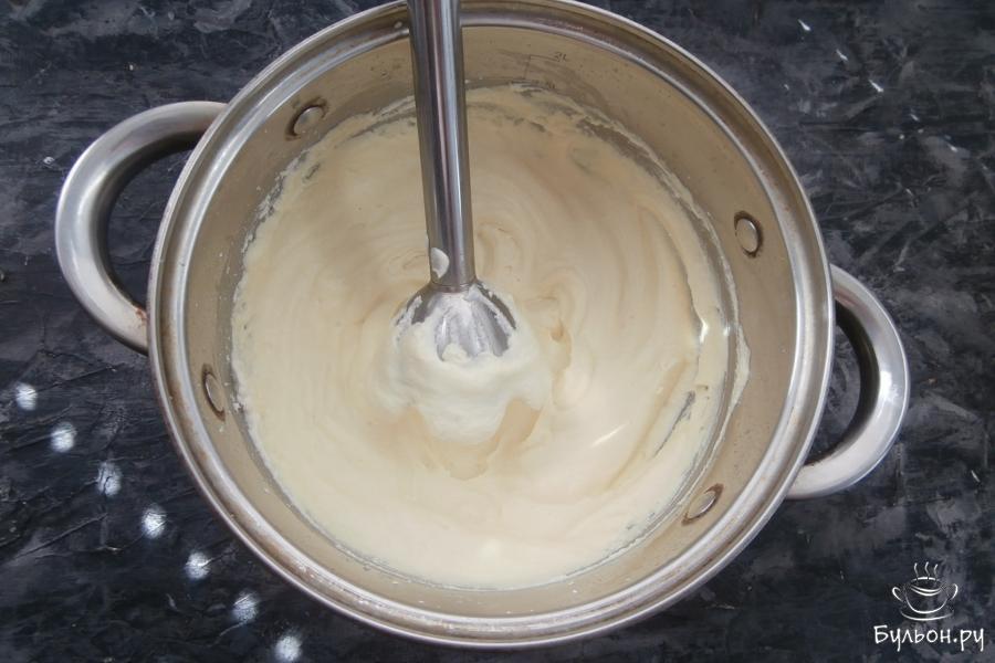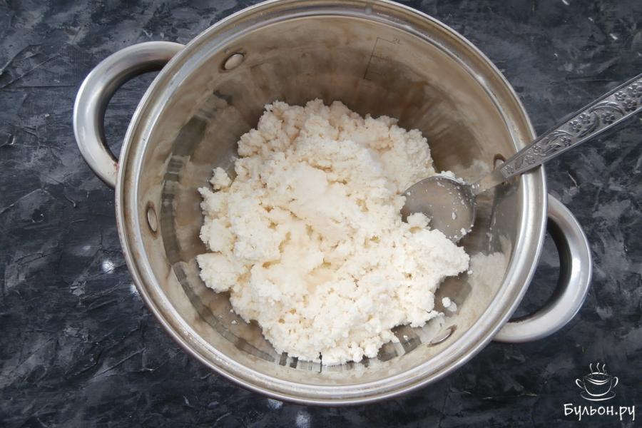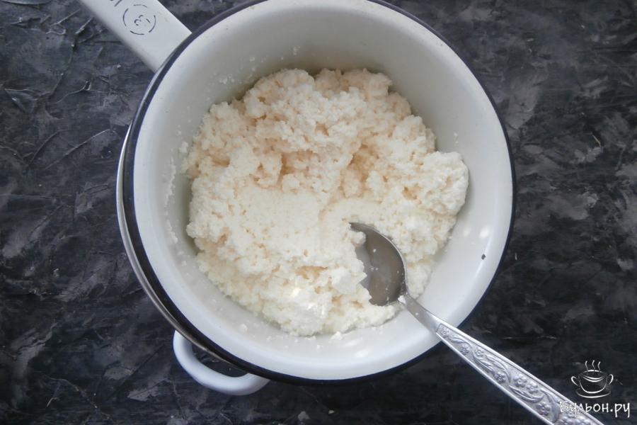 7. Поместить все на маленький огонь и, часто помешивая, дать творогу начать плавиться. Всыпать куркуму (по желанию), массу перемешать. Если в массе остались крупинки творога, можно ее измельчить еще и погружным блендером до более однородного состояния.