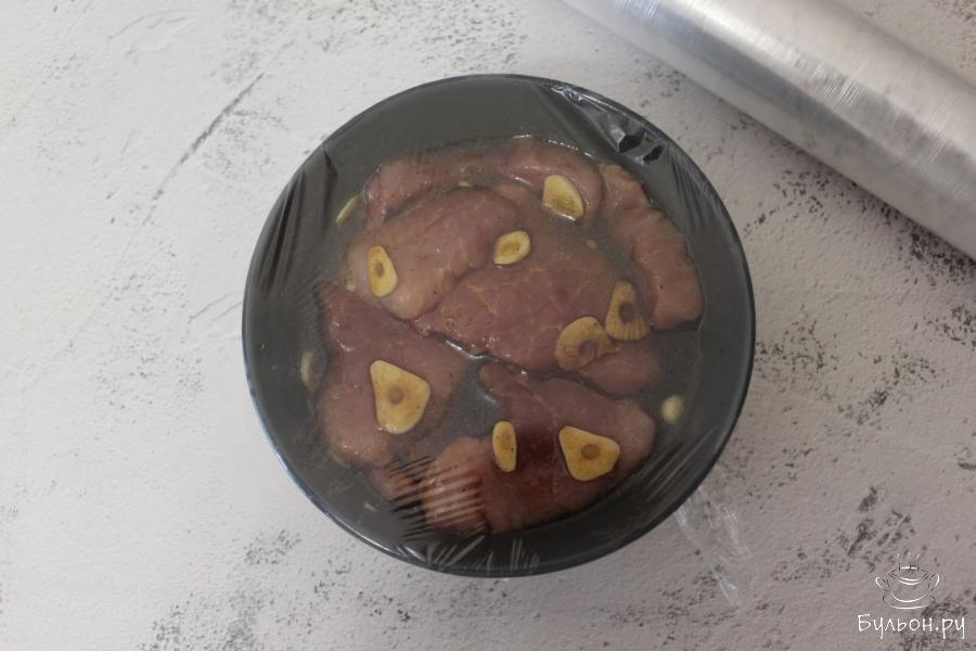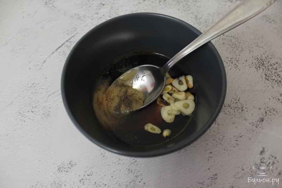 2. Готовим соус для мяса. Вливаем в миску темный соевый соус и кунжутное масло, добавляем мед, чеснок, нарезанный пластинками, и перчим. Перемешиваем так, чтобы соус стал одной консистенции, а мед растворился в соусе.