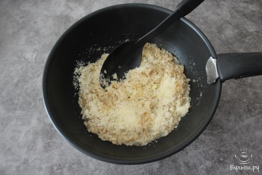6. Снова вольем в сковороду 1/5 от общего количества бульона и опять будем варить, пока жидкость не выпарится. Будем так готовить, пока рис не сварится, оставив немного бульона. Затем добавляем 2 ст. л. бульона, натертый пармезан, перемешиваем и снимаем сковороду с огня.