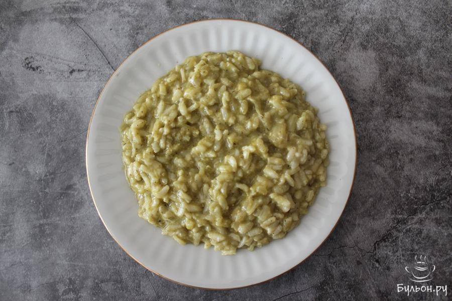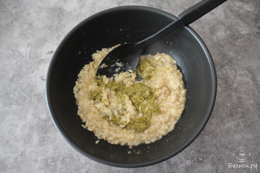 7. Выкладываем к рису соус песто и перемешиваем. Если нужно, добавляем соль, но поскольку пармезан, бульон и песто соленые, то, скорее всего, досаливать блюдо не надо.
