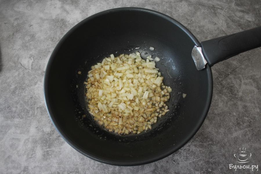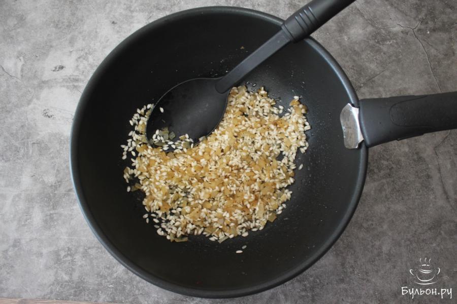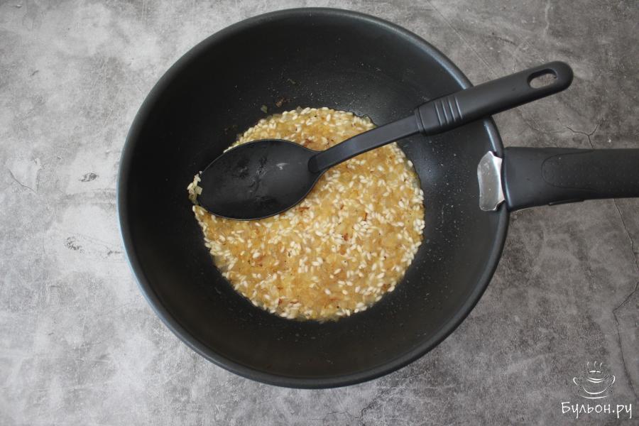 4. Всыпем рис и, перемешивая, обжарим его вместе с луком. Когда рис станет полупрозрачным, вольем 1/5 куриного бульона и будем готовить рис, пока весь бульон не выпарится.
