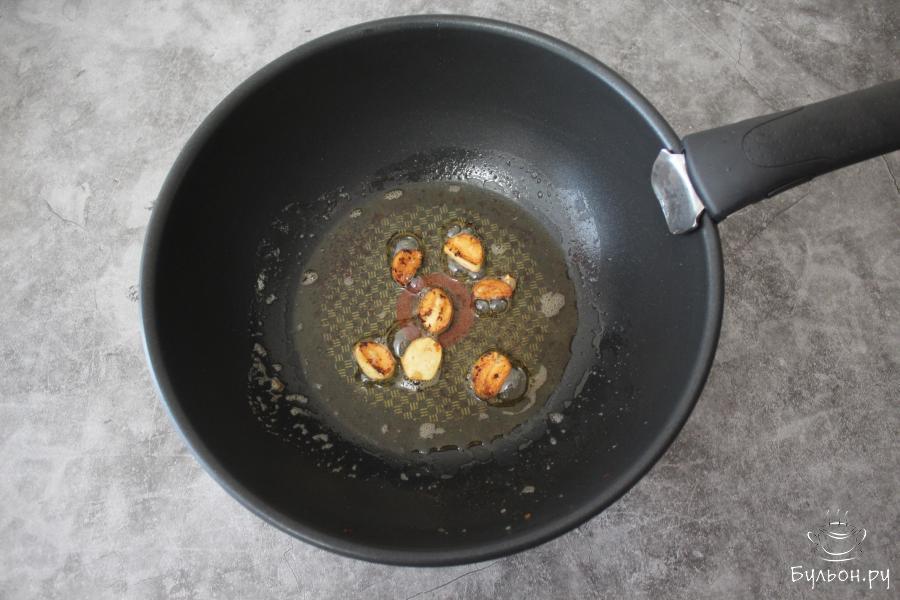 2. В сковороде прогреем сливочное и рафинированное масла. На их основе обжарим дольки чеснока для аромата. Обжаренные кусочки чеснока извлечем из сковороды, чтобы они не горели при дальнейшей готовке ризотто.