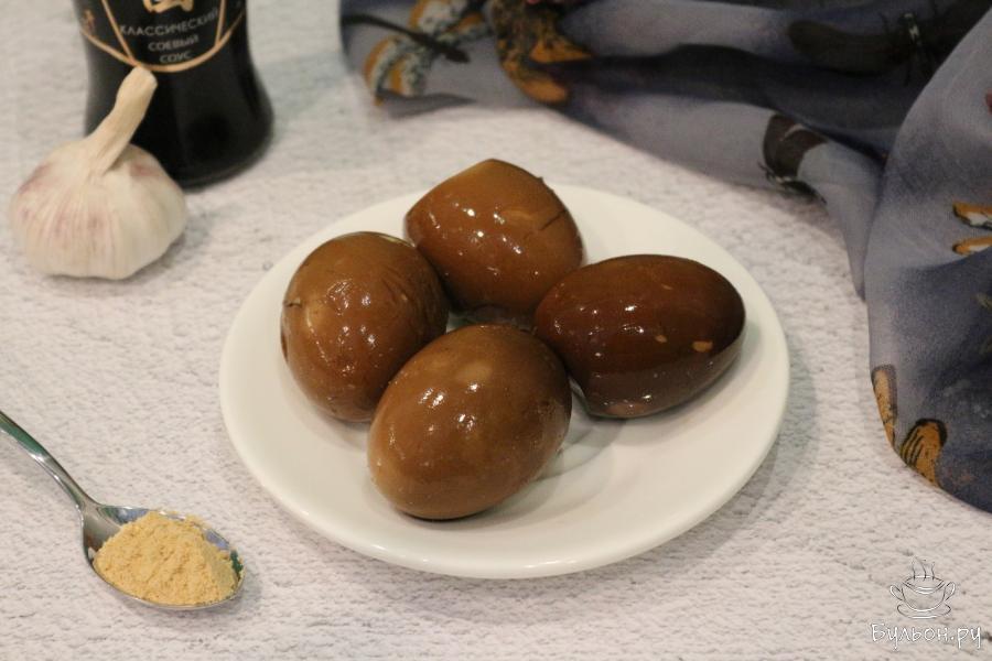 Если вы любите яйца так, как их люблю я, то смело берите рецептик себе в копилку. Яйца по этому рецепту получаются коричневого цвета, по вкусу - очень необычным, имеют пряный солоноватый вкус, который достигается за счет, не только соевого соуса, но и за счет большого количества других ингредиентов, таких как чеснок, имбирь, зеленый лук, перец, уксус, сахар. Мариновать их можно и больше суток, в этом случае вкус яиц будет более насыщенным.