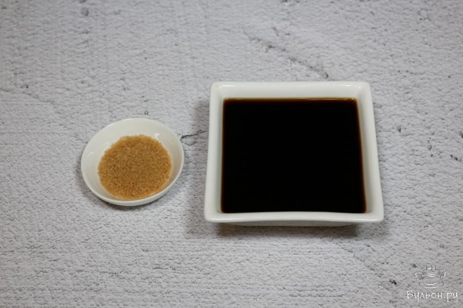 3. Приготовим маринад. В мисочке смешиваем следующие ингредиенты: вода, соевый соус, уксус и сахар. Размешайте все так, чтобы сахар растворился.