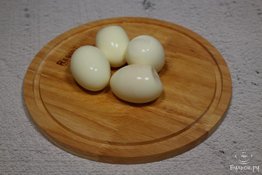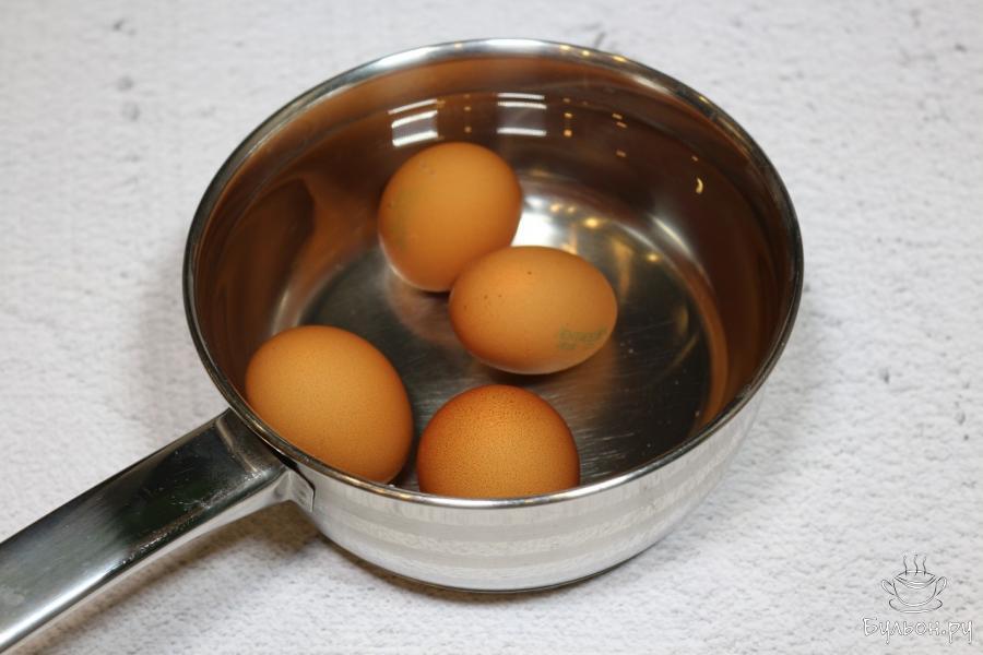 1. Яйца комнатной температуры заливаем водой, добавив щепотку соли. Варим яйца в течении 7 минут, после закипания воды.