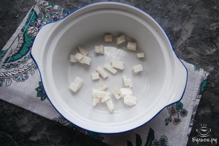 1. Свежее свиное сало (можно и соленое) порезать маленькими кубиками, выложить в небольшую кастрюльку, которая подходит для СВЧ и поместить в печь на 2 мин. с мощностью 700-750 Вт.