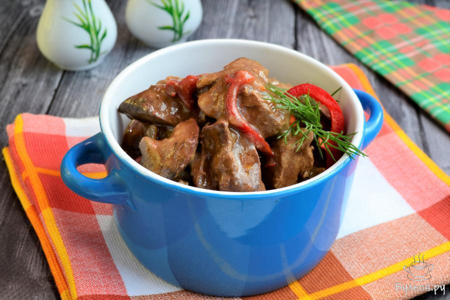 9. Накрыть крышкой кастрюлю с печенкой и готовить ее далее в печи (мощность такая же) 10-12 минут. Обязательно разрежьте печенку и проверьте ее готовность.