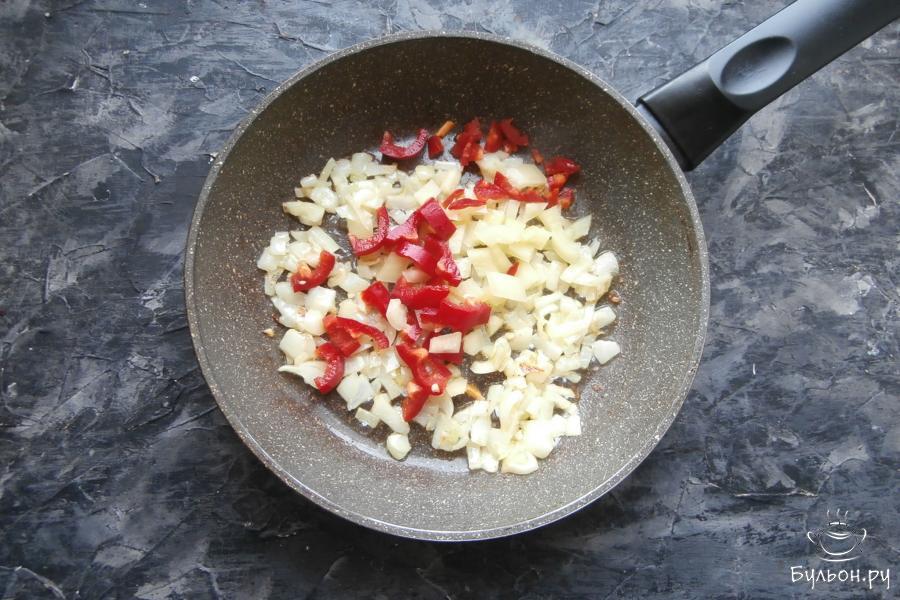 5. Добавить в сковороду сладкий перец, а также, чили перец, все хорошо смешать и жарить еще мин.3-4.