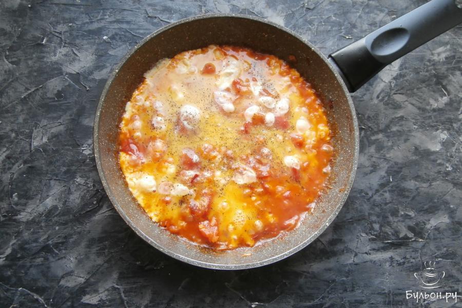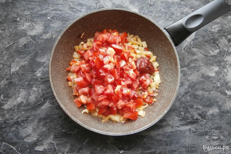 6. Далее, добавить помидоры и томатную пасту, все смешать и обжаривать на небольшом огне 5-7 мин. Помидоры должны стать мягкими и превратиться в жижу.