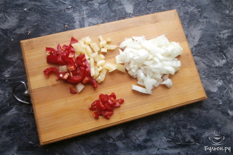 1. Болгарский перец или турецкий зеленый перец порезать соломкой или квадратиками, лук порезать мелко измельчить перец чили.