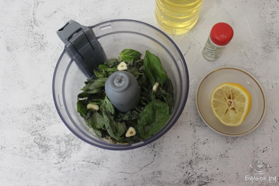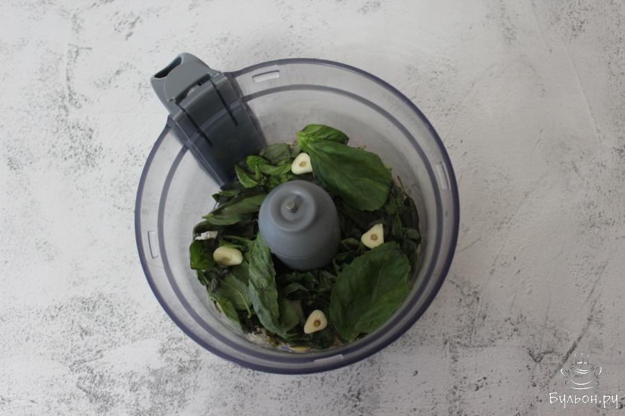 3. Также, в чашу блендера, выложите листики базилика без стебельков и зубчик чеснока, разрезанный на несколько частей.