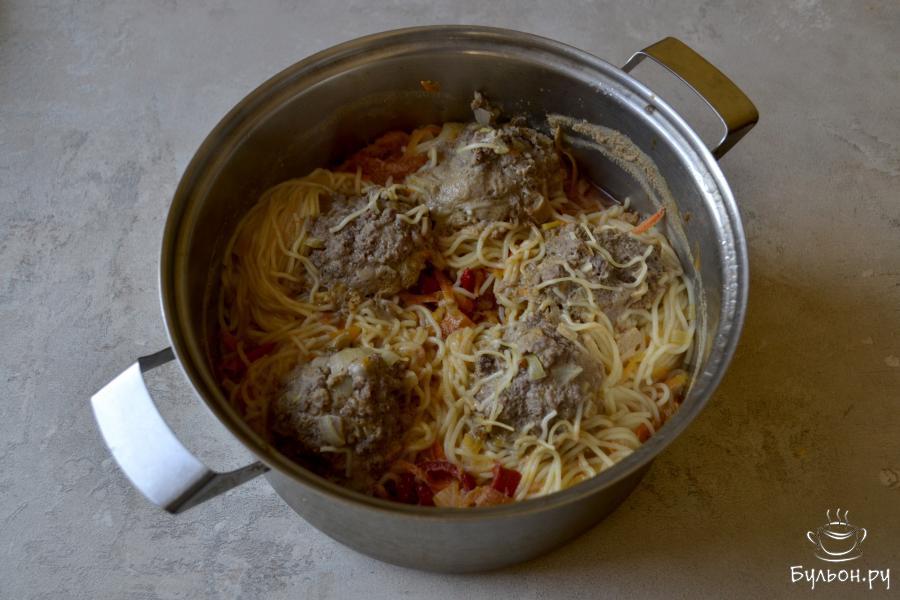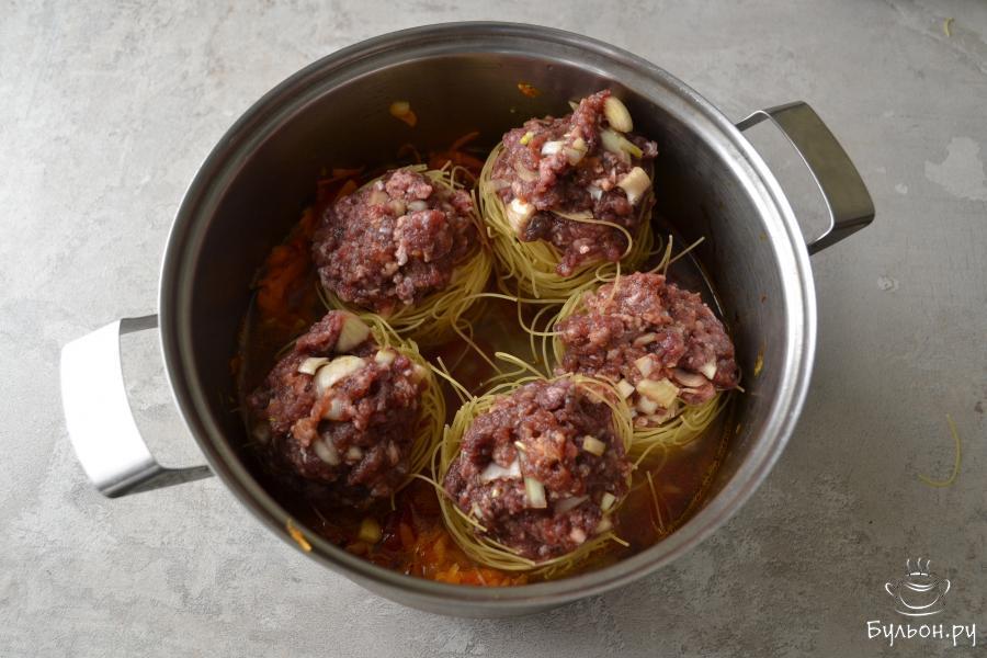 11. Готовьте макароны-гнезда с фаршем на среднем огне, после закипания, в течение 20-25 минут. За это время вода почти вся впитается в макароны.