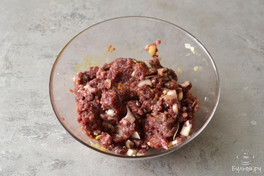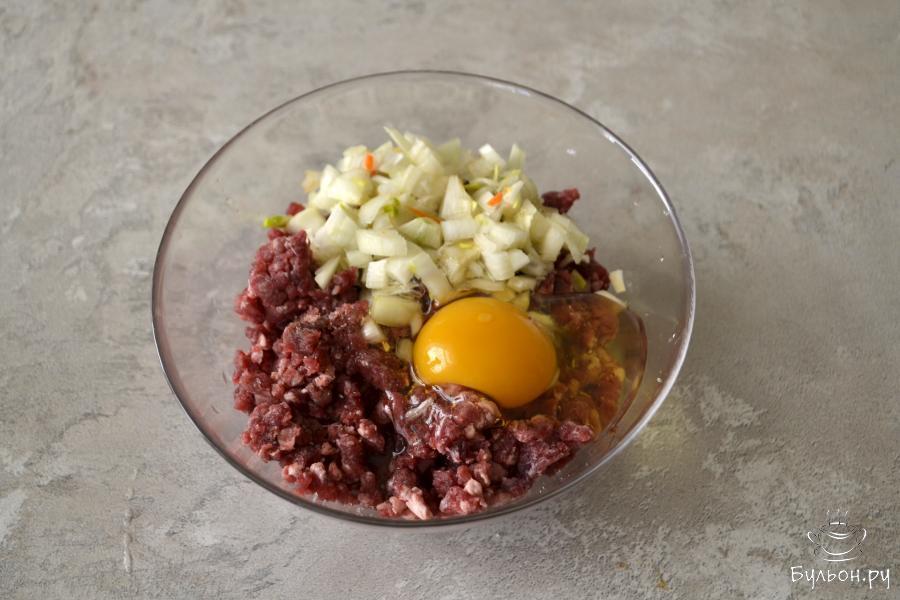 6. В миску с фаршем положите нарезанный репчатый лук (1 шт.), вбейте яйцо, посолите и посыпьте черным молотым перцем.