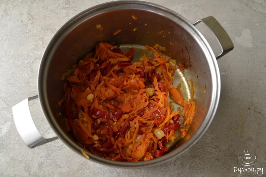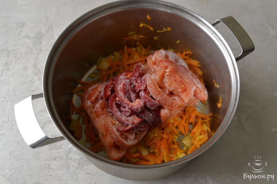 4. Затем, добавьте замороженный болгарский перец и помидоры. Вместо замороженных овощей, можно использовать свежие.