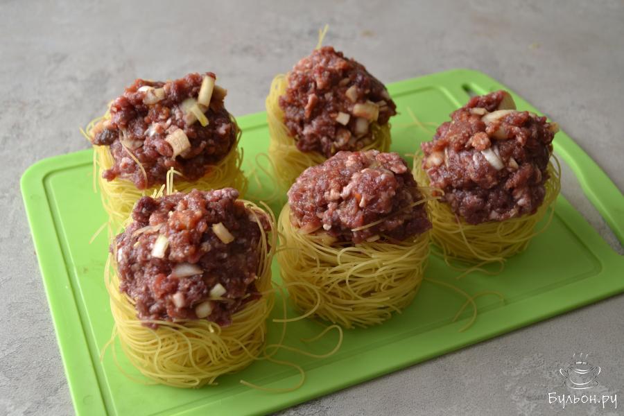 12. Очень вкусное, не самое сложное в приготовлении мясное блюдо готово. Подавайте макароны-гнезда с фаршем сразу же, пока они горячие. Приятного аппетита!