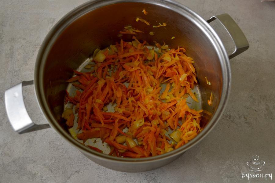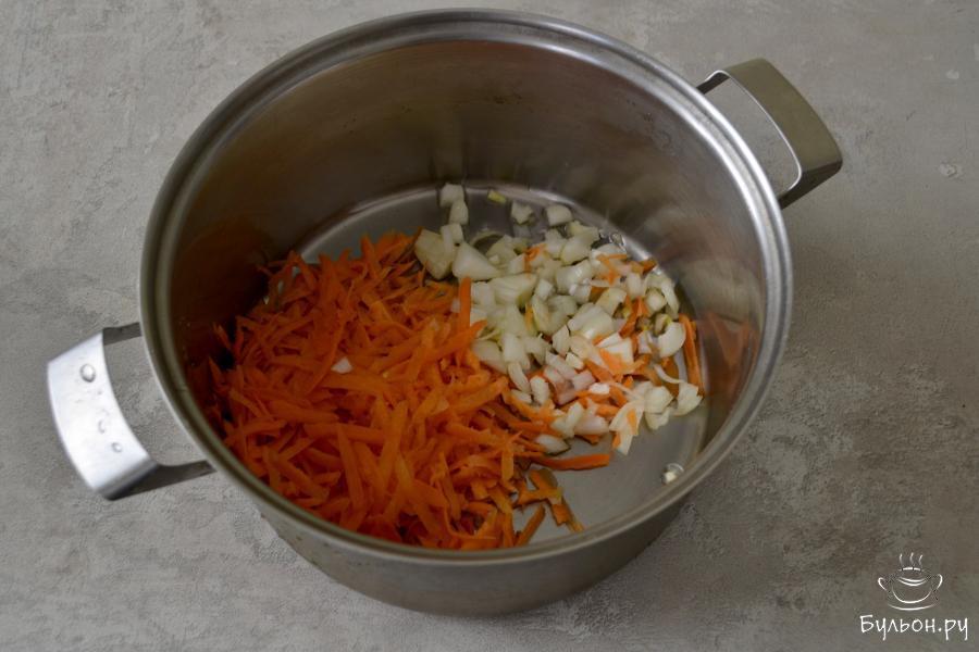 2. В небольшую кастрюлю с толстым дном или сотейник, влейте масло растительное и разогрейте. Положите лук и морковь.