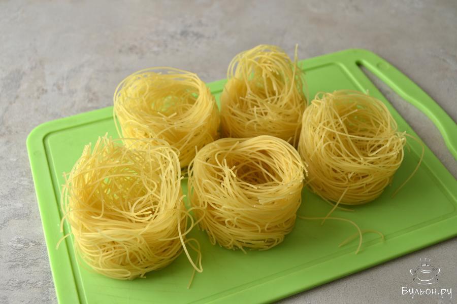 Для приготовления этого блюда, вам понадобятся макароны-гнезда или салангани - это вид макарон, скрученных определенным образом и предназначенных для фарширования. Фарш можно использовать любой: куриный, свиной, говяжий или смесь двух видов фарша. Овощи для поджарки также можно взять по вкусу: лук, помидоры, морковь, болгарский перец. Блюдо готовится быстро, не сложно, а внешний вид очень интересный, вкус потрясающий. Попробуйте приготовить!