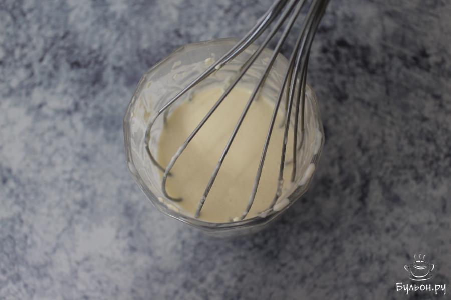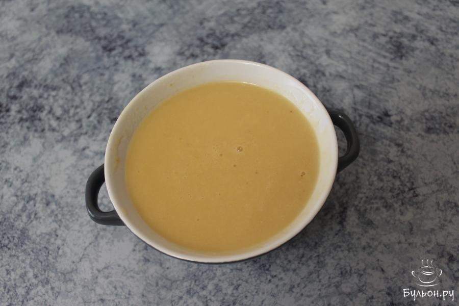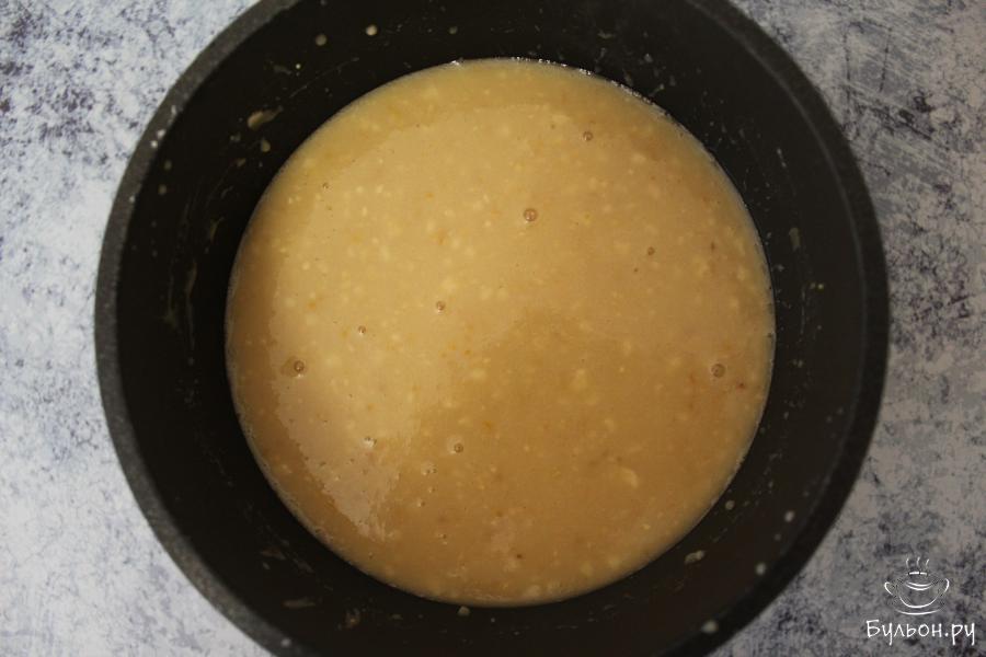 3. Когда молочно-сливочная смесь закипит, вводим тонкой струйкой молочно-мучную жидкость, постоянно мешаем. Готовим до загустения. Снимаем ковшик с плиты и накрываем пищевой пленкой так, чтобы между кремом и пленкой не было воздуха.