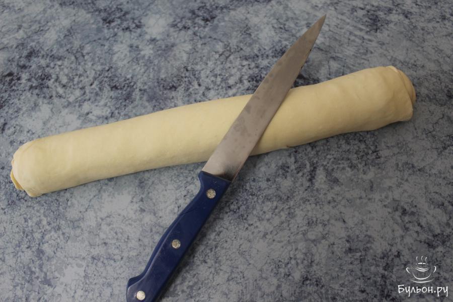7. Раскатываем, по отдельности, 2 пласта слоеного теста и накладываем, ровно, один пласт на другой, сворачиваем в рулет и нарезаем на 12 частей.