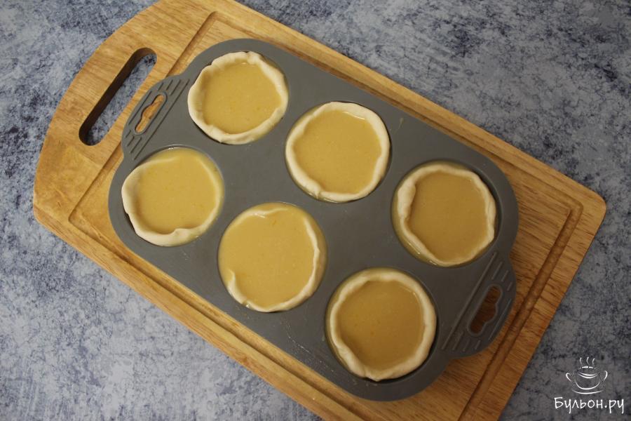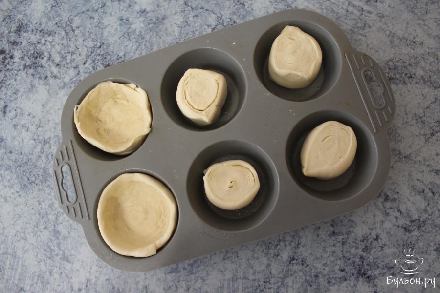8. Форму с круглыми ячейками смазываем маслом и в каждую ячейку кладем по 1 части теста, а затем делаем бортики так, чтобы получилась корзиночка.