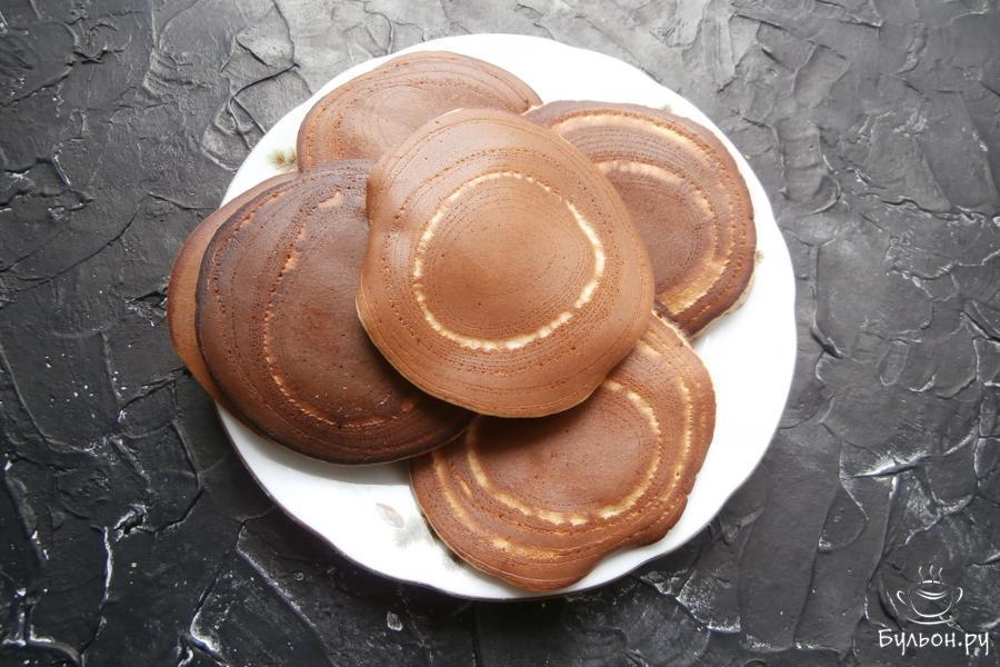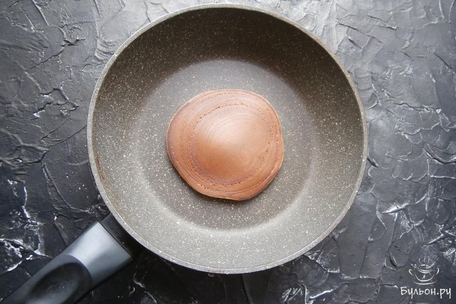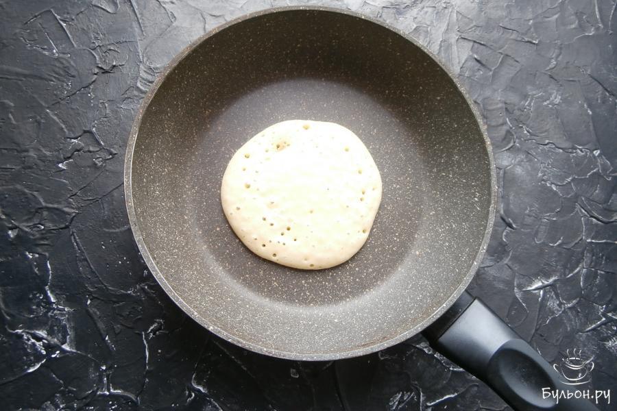 5. Сковородку разогреть без жира и в ее центр наливать ложкой (по 2 ст. л.) тесто, которое должно само растечься в лепешку.