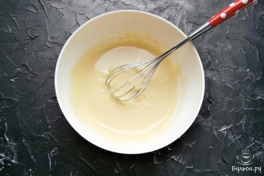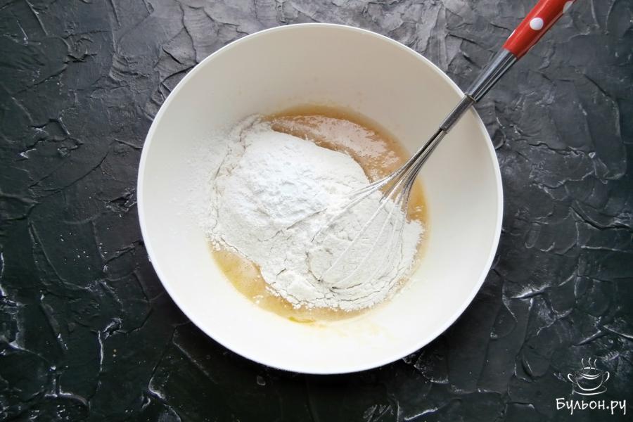 2. Тщательно размешать все венчиком до однородности. Всыпать просеянную муку с ложечкой разрыхлителя.