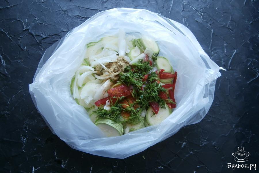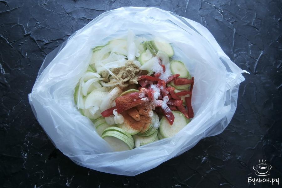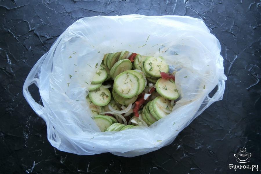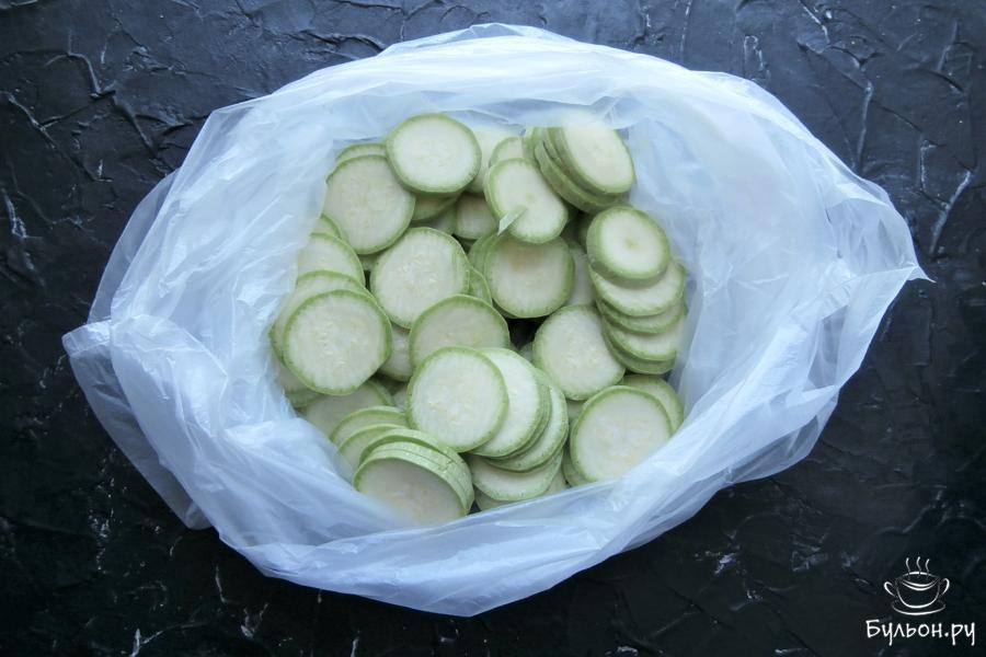 8. Пакет с кабачками поместить в холодильник на пару часов. Раза два за это время пакет нужно снова потрясти.