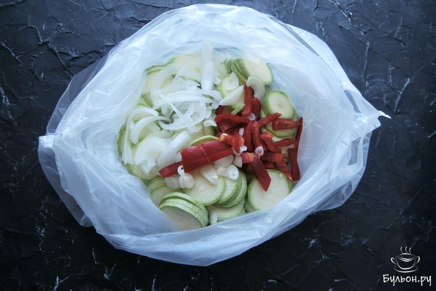4. Добавить прямо в пакет порезанный соломкой болгарский перец, порезанный тонкими полукольцами лук и порезанный кружочками чеснок.