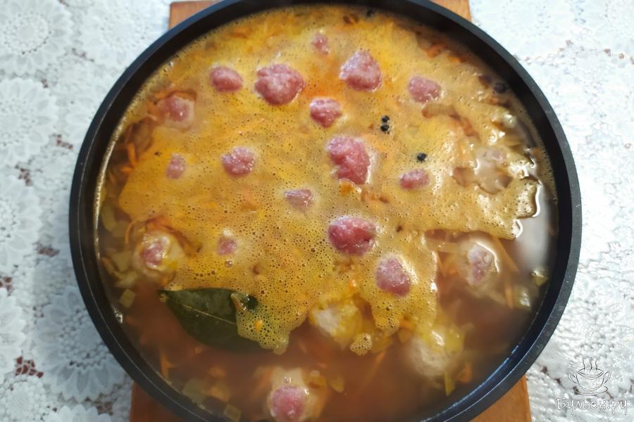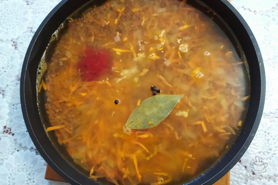 6. Налить воду. Добавить измельченный чеснок, лавровый лист, душистый перец, кетчуп и 2 щепотки соли. Довести до кипения.