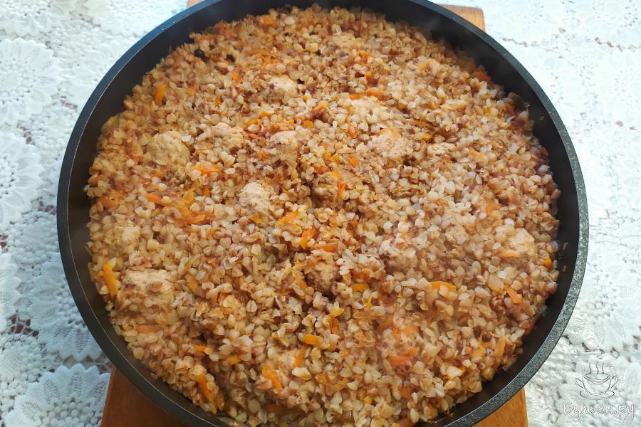 8. Накрыть крышкой, тушить блюдо до испарения жидкости, примерно 20 минут. Вкусная гречка с фрикадельками на сковороде готова. К столу подать в горячем виде.