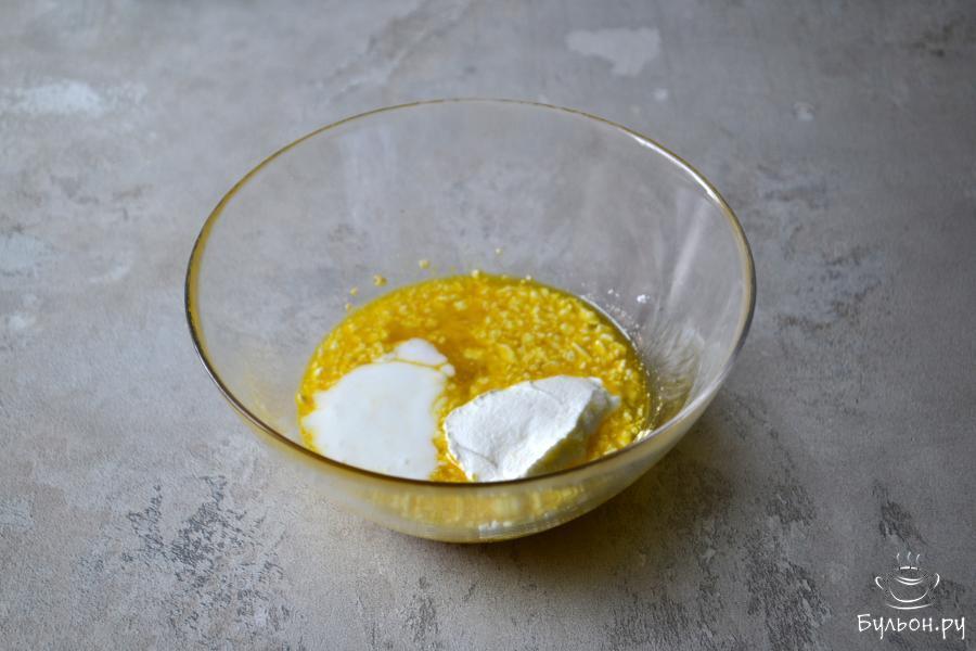 2. Ложкой разотрите творог с яйцом и сахаром, чтобы получилась однородная консистенция, добавьте сметану и кефир.