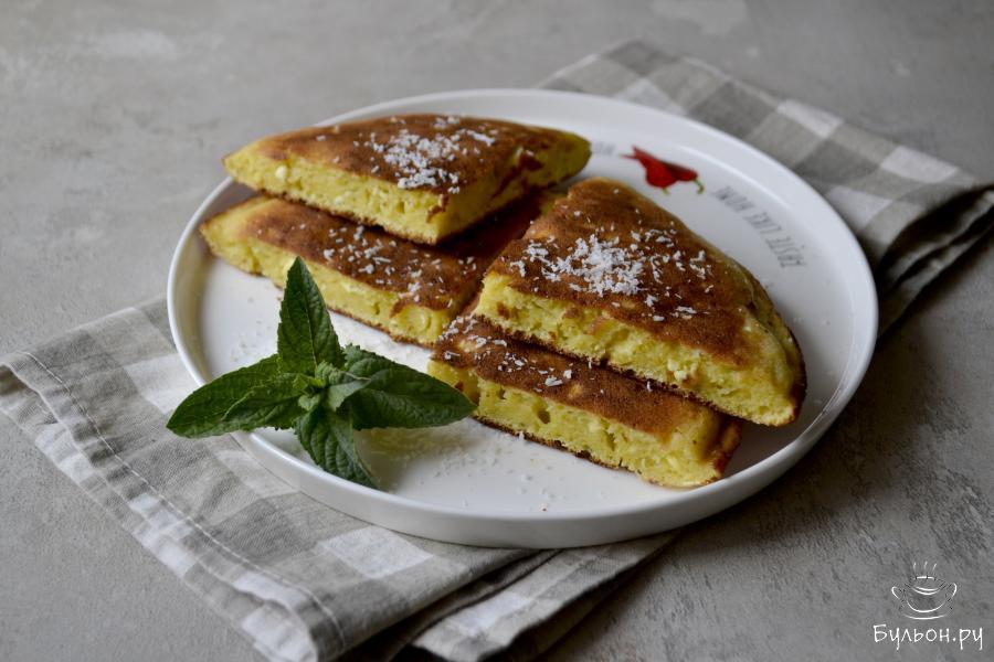 10. Испеченную лепешку разрежьте на кусочки и пора пробовать. Вкусная, мягкая, с хорошим кокосовым ароматом лепешка придется по вкусу любителям творожной и кокосовой выпечки.