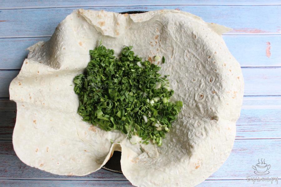 2. Любую любимую зелень промоем, обсушим и мелко нарежем. Выкладываем зелень на яйцо, солим. Количество зелени тоже делаем по своему вкусу.