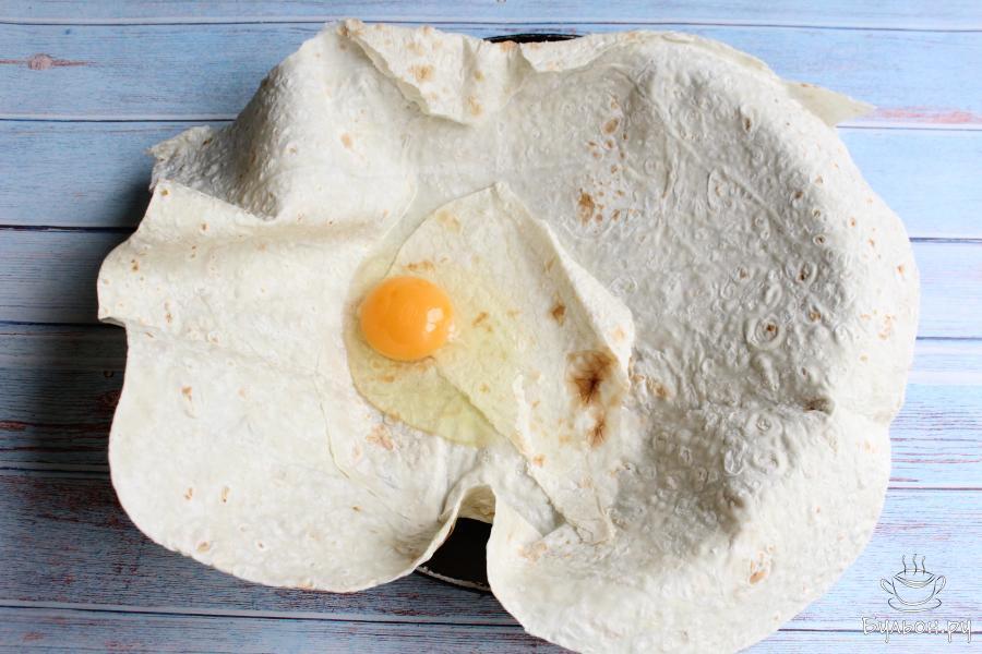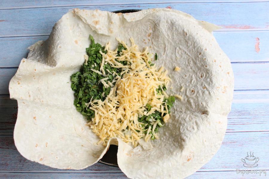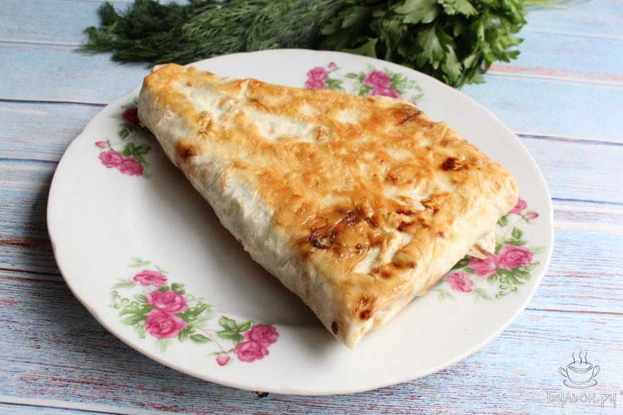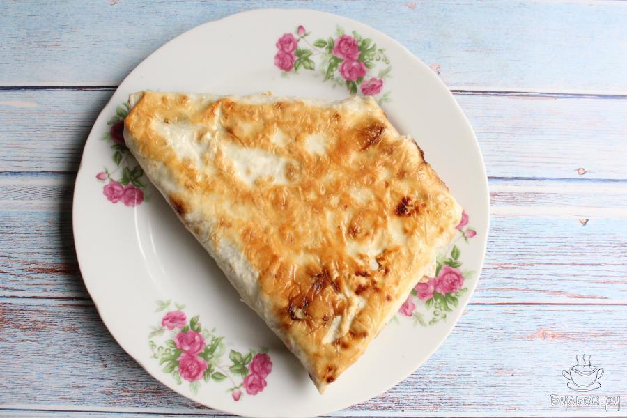 4. Заворачиваем лаваш конвертиком или треугольником. Обжариваем еку на среднем огне с двух сторон по несколько минут до румяности.