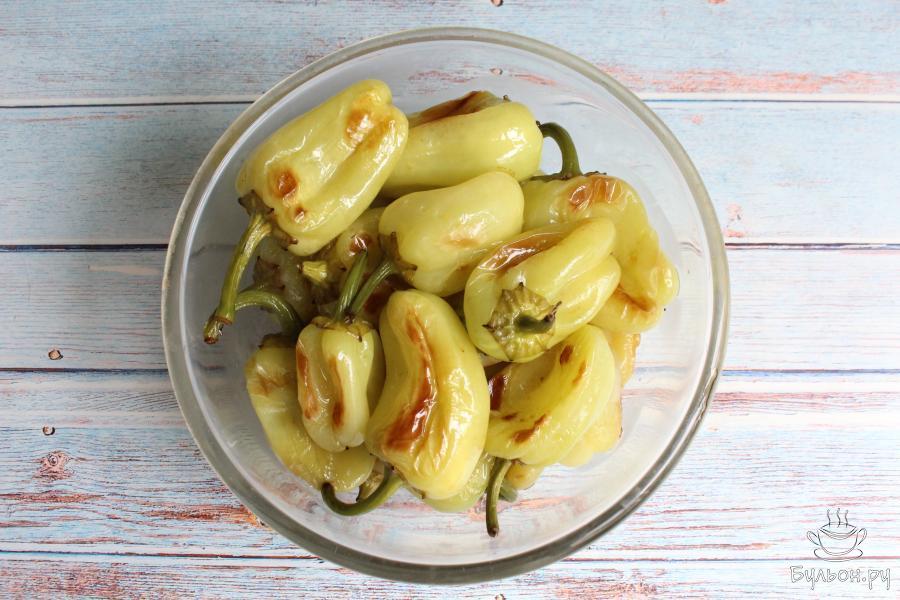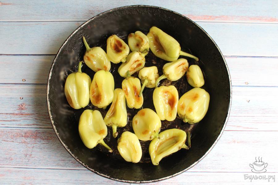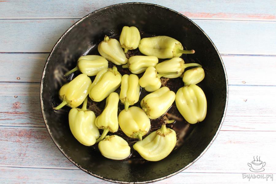 2. Чтобы перец не сильно "стрелял", выкладываем его в холодное масло, накрываем крышкой и ставим сковороду на огонь. Жарим перец 5-6 минут, отставляем сковороду, через минуту открываем крышку.