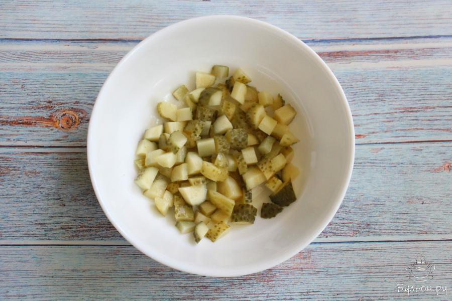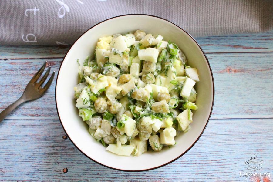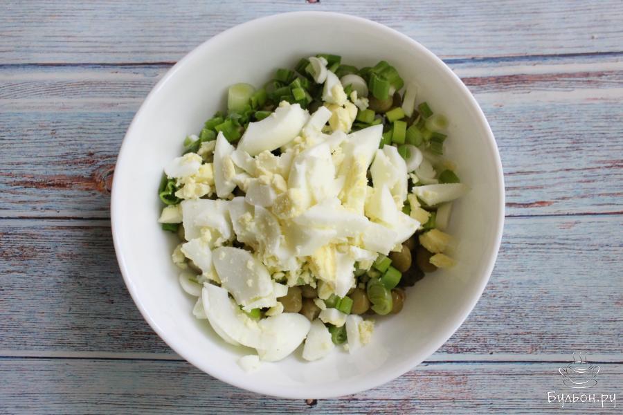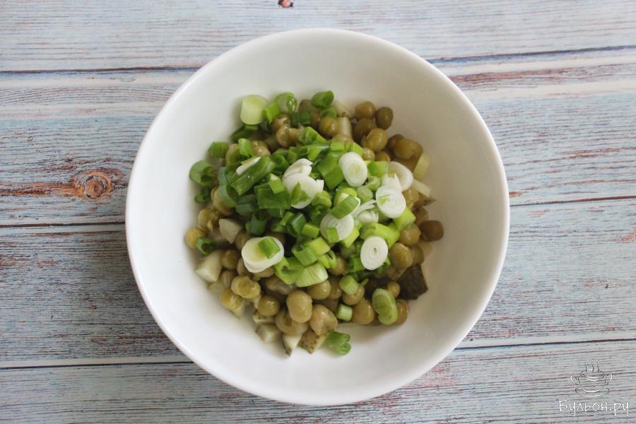2. Добавим в чашку с огурцами горошек. Зеленый лук промоем, почистим, мелко нарежем и добавим в салат.