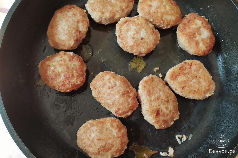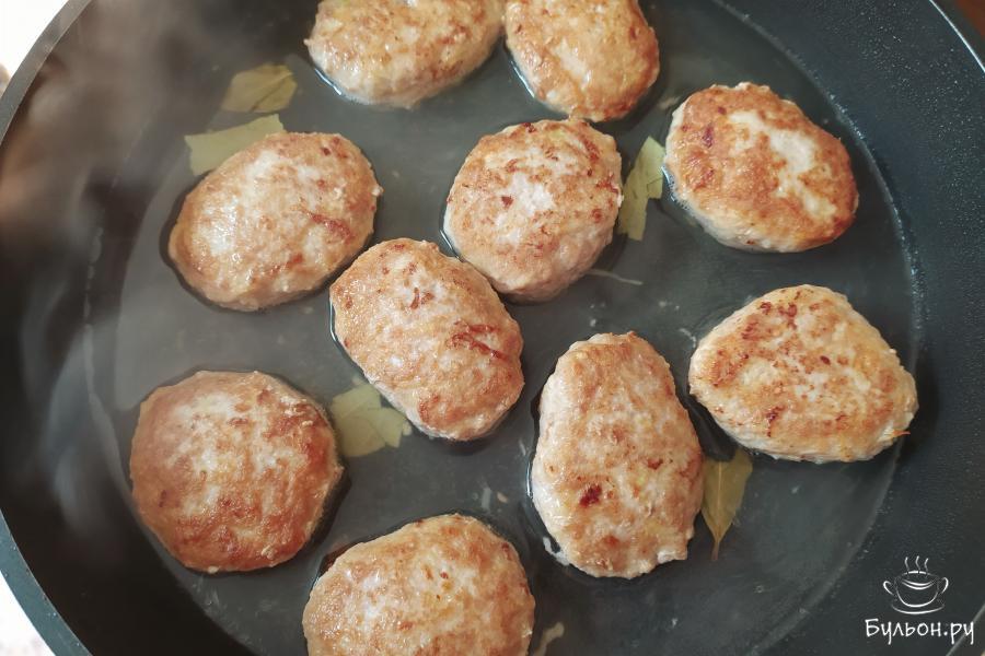 5. Затем сковороду протереть или взять другую чистую сковородку. Налить 200 мл воды и добавить разломанный лавровый лист. Выложить котлеты в воду.