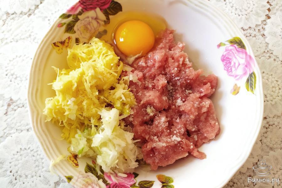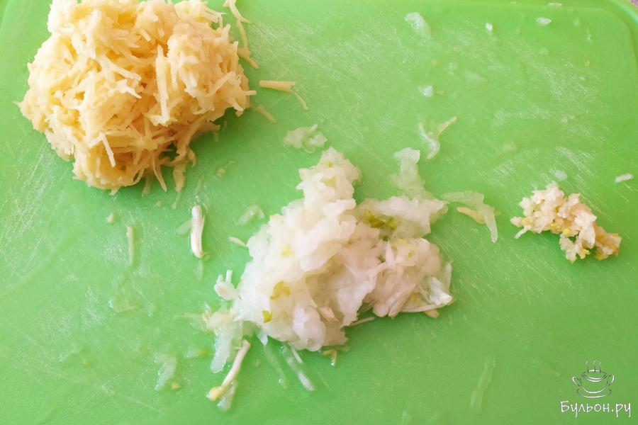 1. Картофель, лук и чеснок почистить. Картошку и зубчики чеснока натереть на мелкой терке, лук - на крупной. Отжать немного сок с овощей.