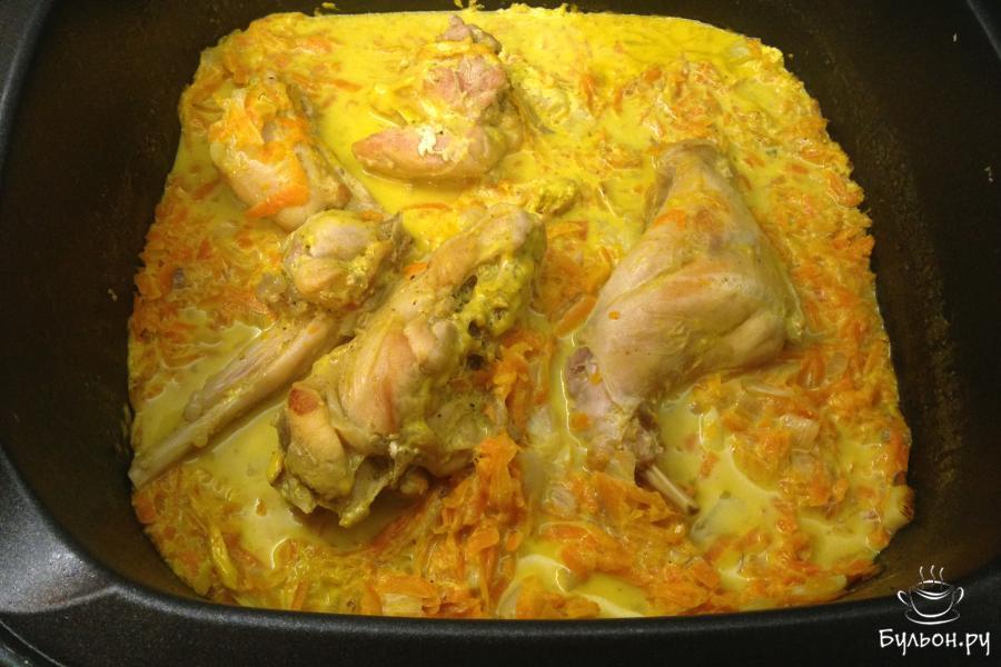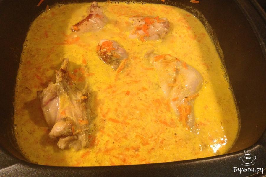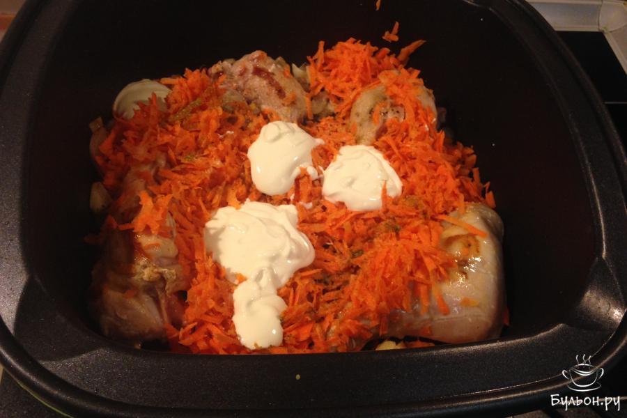 4. Переключить на режим "тушение". Добавить морковь, чеснок, сметану, соль, перец. Долить воды столько, чтоб покрывало 3/4 объема кролика. Тушить под крышкой 30-40 минут. При необходимости помешивать, добавлять воду.