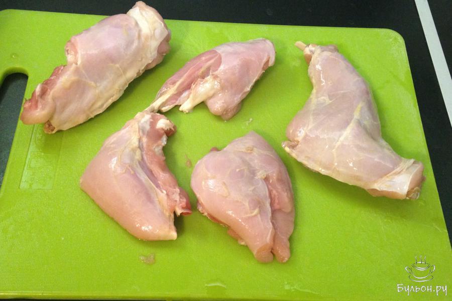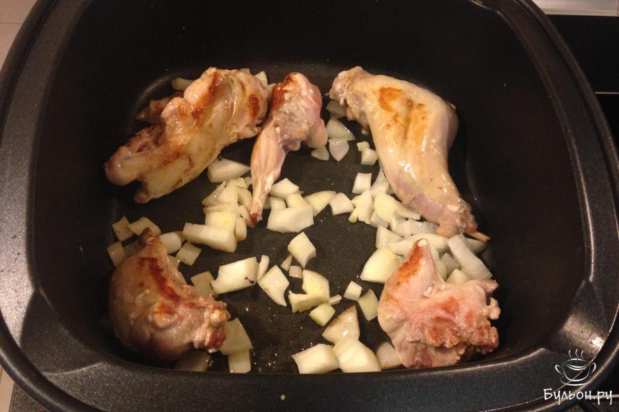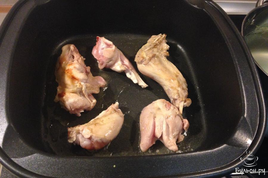1. Кролика промыть, обсушить, разделить на небольшие куски. Лук порезать не очень мелко, морковь натереть на крупной терке, чеснок раздавить тупой стороной ножа.